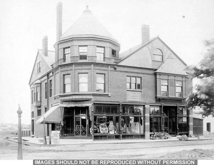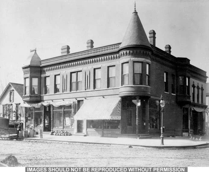 2 storey brick building with one corner shop and another shop to each street; corner conical roofed turret, oriels to either street, brick façade with rock faced upper window lintels, semi-machiciolated cornice, canopy with '6100 Krueger & Schneider 6100 Medicines'.