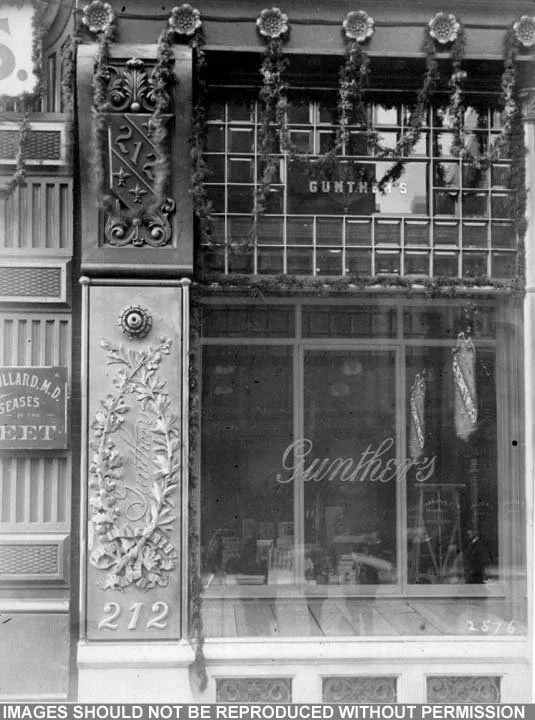 Glazed shop window of 'Gunther's', no 212 (possibly artist's materials?).