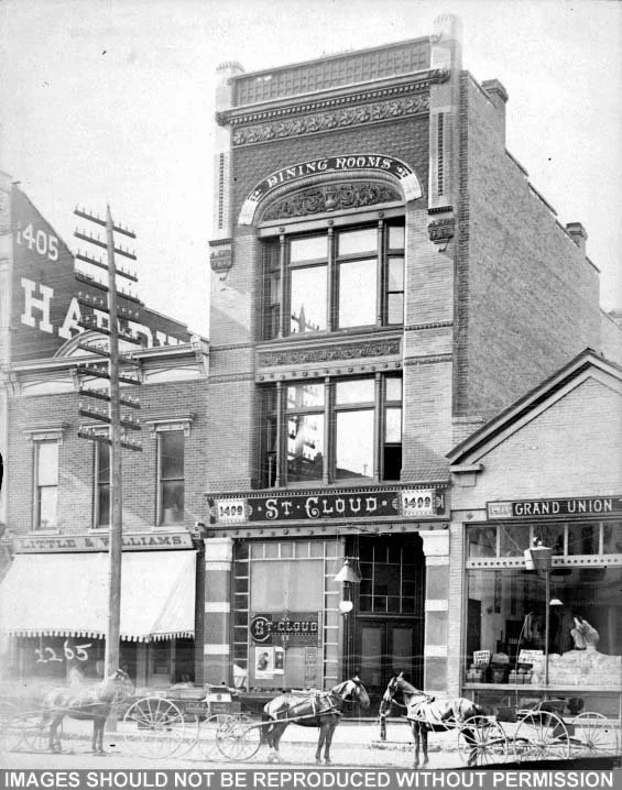 3 storey building with 'Dining Room' on a basket arch at the top, and at the bottom a glazed shopfront with '1409 St. Cloud' 1409' above it and on the glass. Building of Little & Williams to the left, and Grand Union at 1411 to the right.